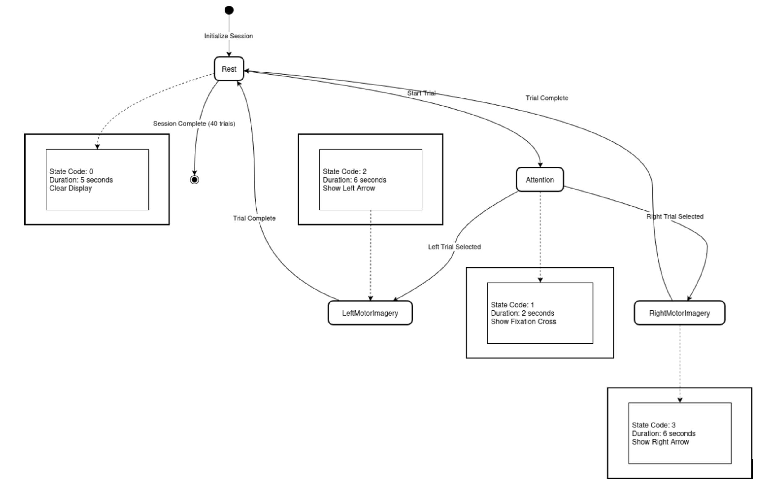 - EEG acquisition procedure: the protocol represents a repetitive cycle of 40 trials (full session), each trial having standardized, time-synchronized steps. The goal is to obtain labeled EEG segments (background/attention, left-hand motor imagery, right-hand motor imagery), required for training AI models