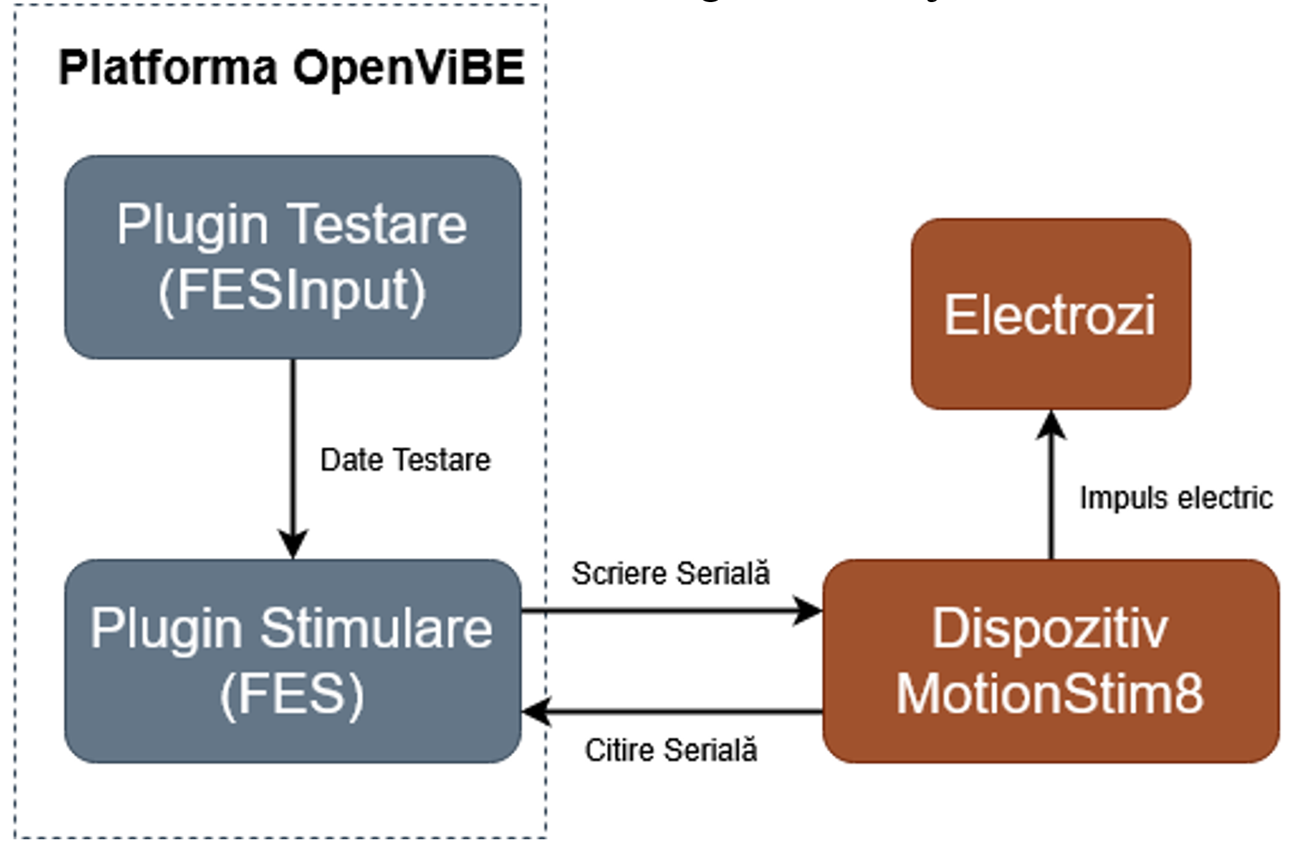 - FES stimulation procedure (Functional Electrical Stimulation): the proposed system includes four essential components that interact with each other to perform functional electrical stimulation. Two plugins were developed on the OpenViBE platform to allow control of the stimulation device