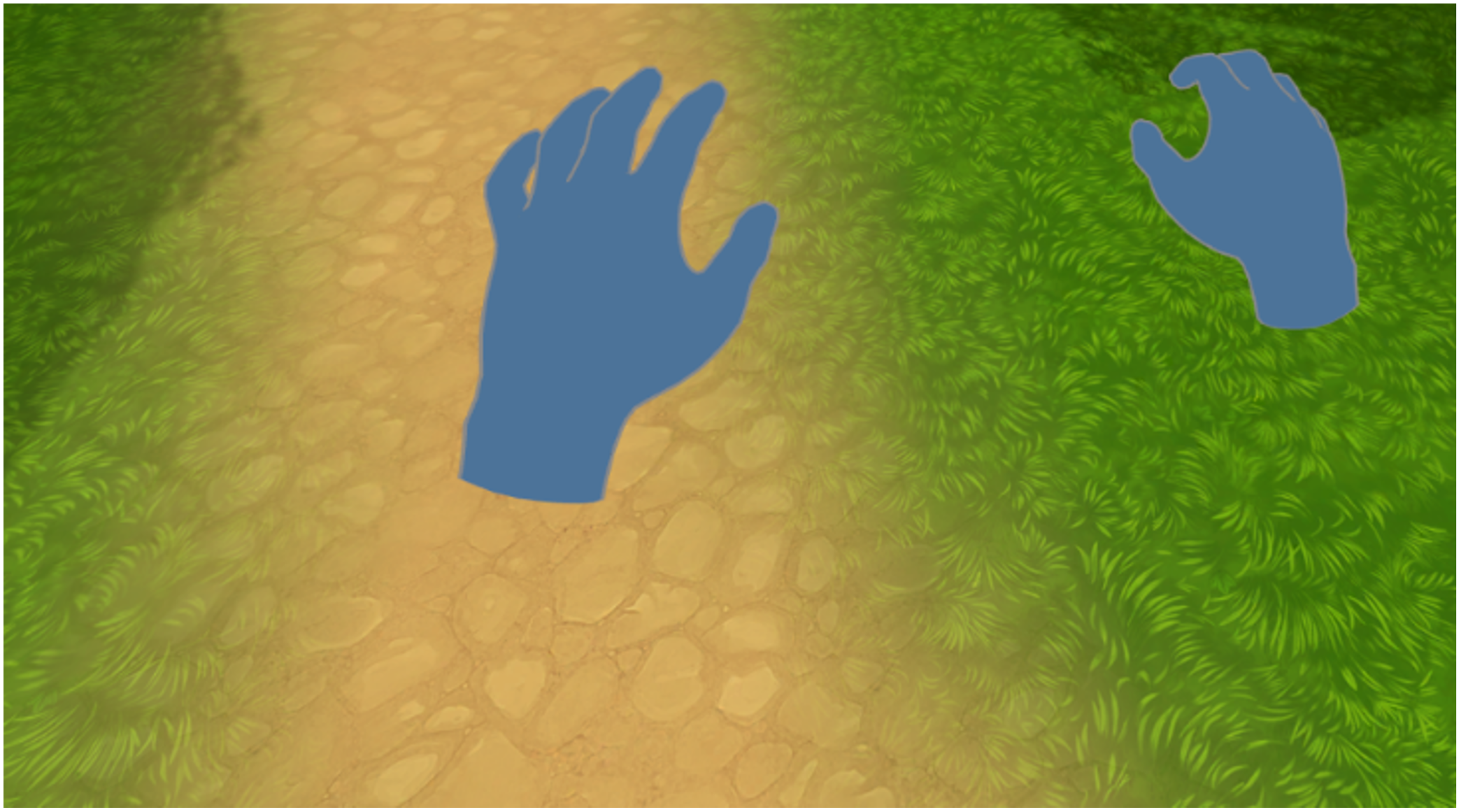 Fig. 4: Screenshot from the VR application showing the “Rocket” exercise, where the patient’s hands were displayed in blue to ensure visibility for a wide range of patients