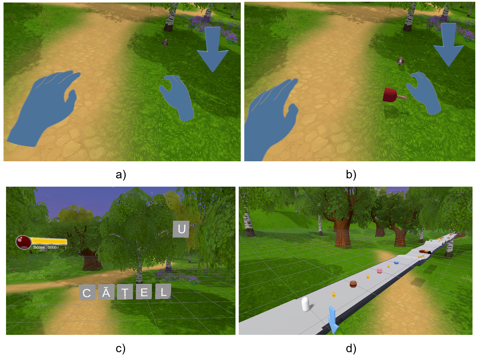 Fig. 5: Screenshots from the game-based exercises used during early neuromotor recovery sessions. The screenshots labeled (a) and (b) are from the “Feeding the Animals” exercise. The screenshot labeled (c) is from the “Letters” exercise. The screenshot labeled (d) is from the “Jumping Over Obstacles” exercise.