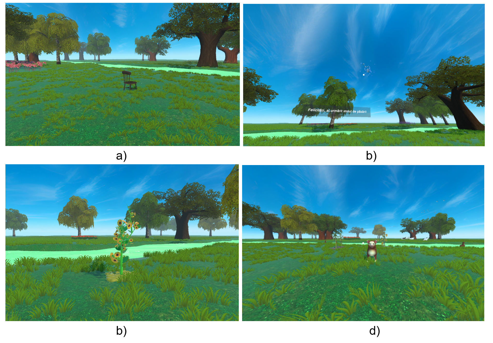 Fig. 6: General scene from the “Nature” environments (a); scene with a congratulatory message from the “Birds” environment (b); scene with a fully developed plant in the “Plants” environment (c); scene showing the puppy and ducks in the “Full” environment (d)