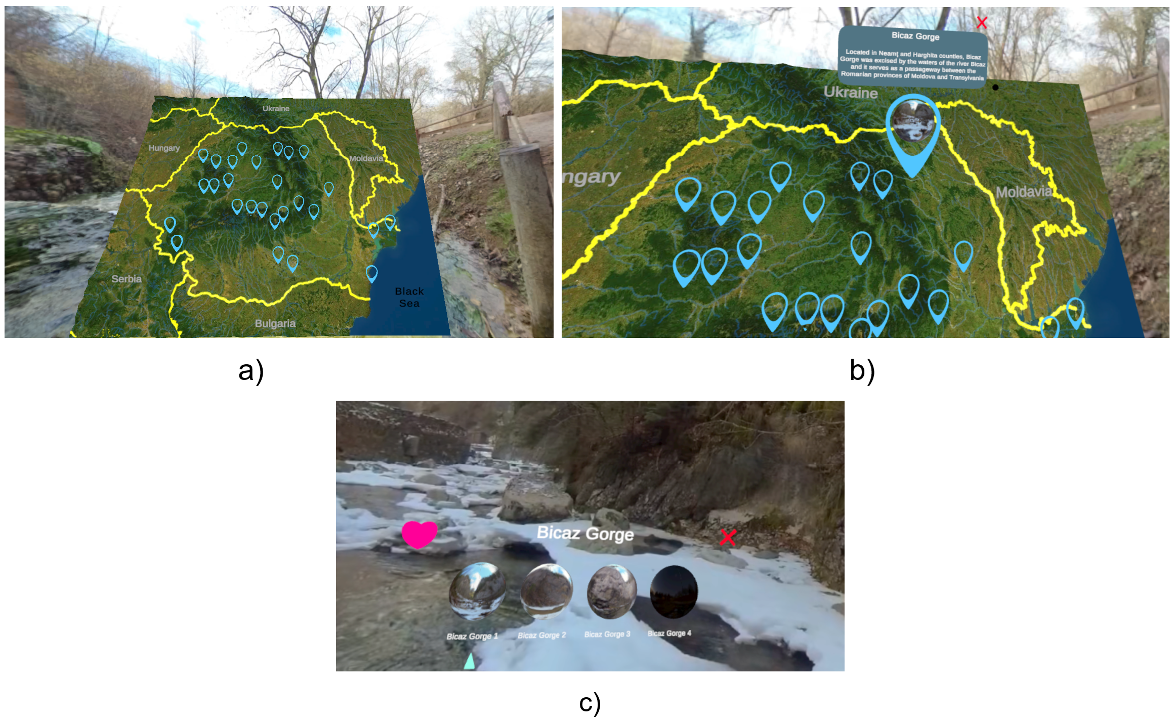 Fig. 8: “WateRO” relaxation environment: map of Romania (a); selecting a pin on the map (b); visiting a location and the menu for selecting another video (c)